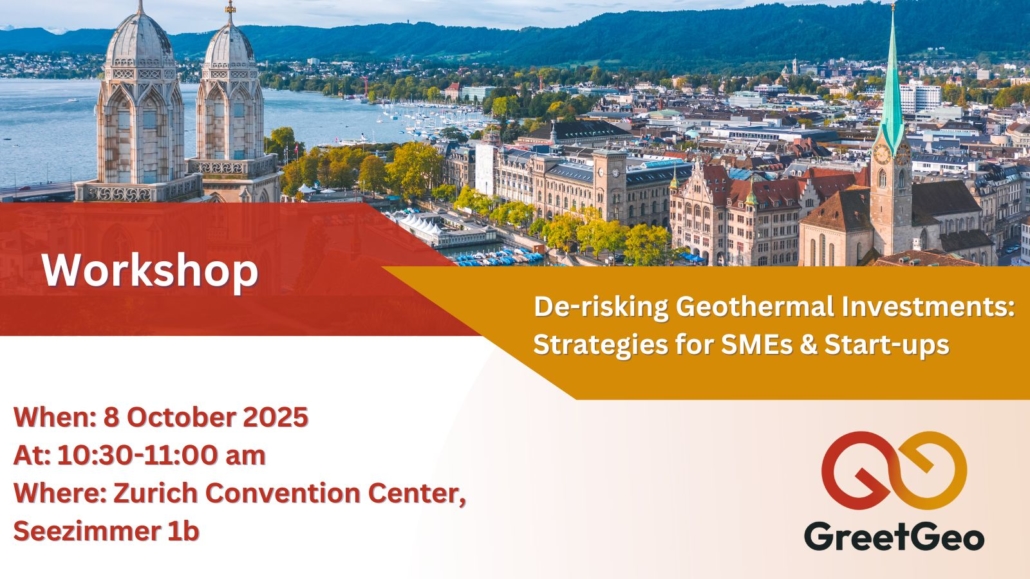 GREET GEO will host a targeted workshop titled “De-risking Geothermal Investments: Strategies for SMEs & Start-ups” at the upcoming European Geothermal Congress (EGC 2025) in Zurich. The session will take place on 8 October 2025, from 10:30 to 11:00, in Seezimmer 1B.